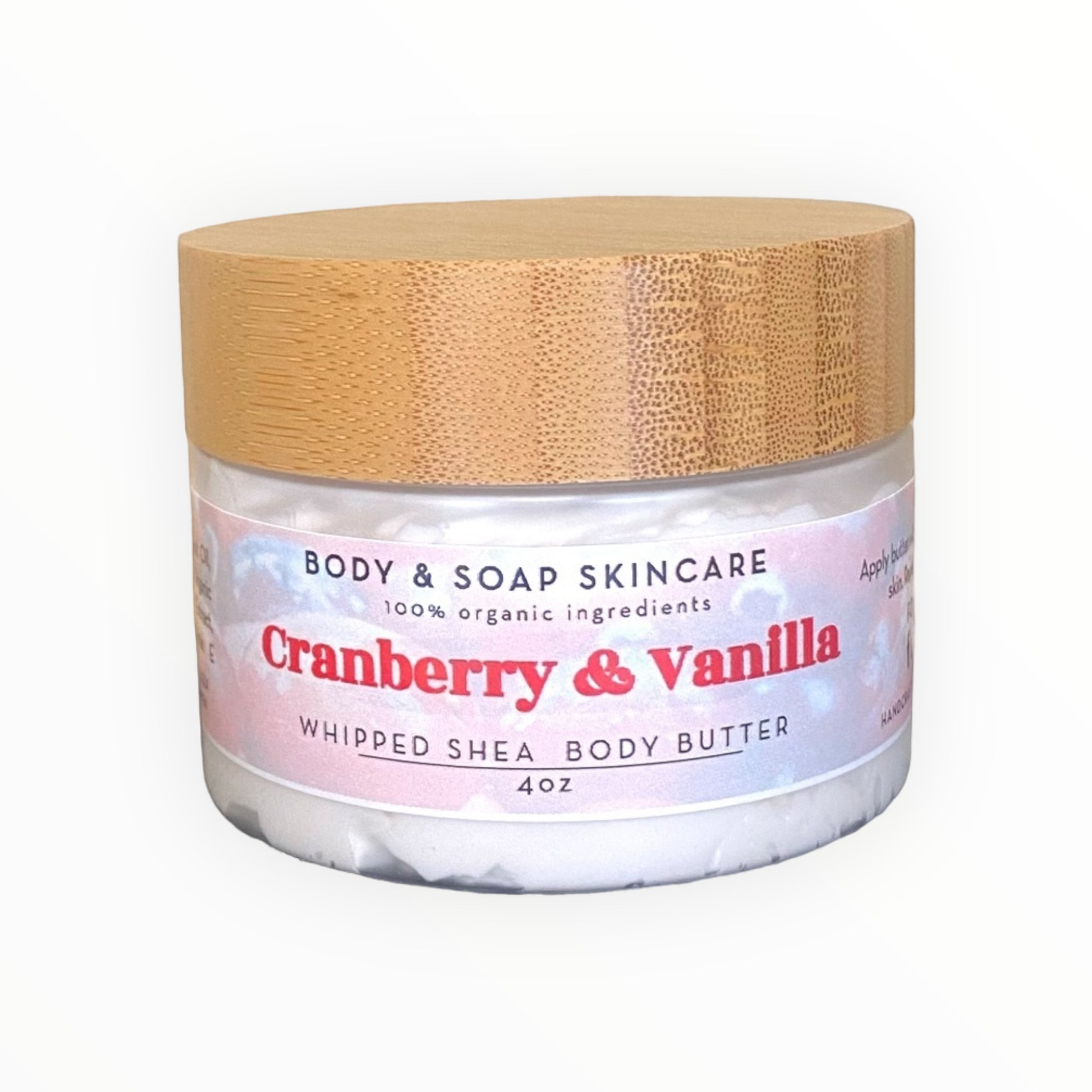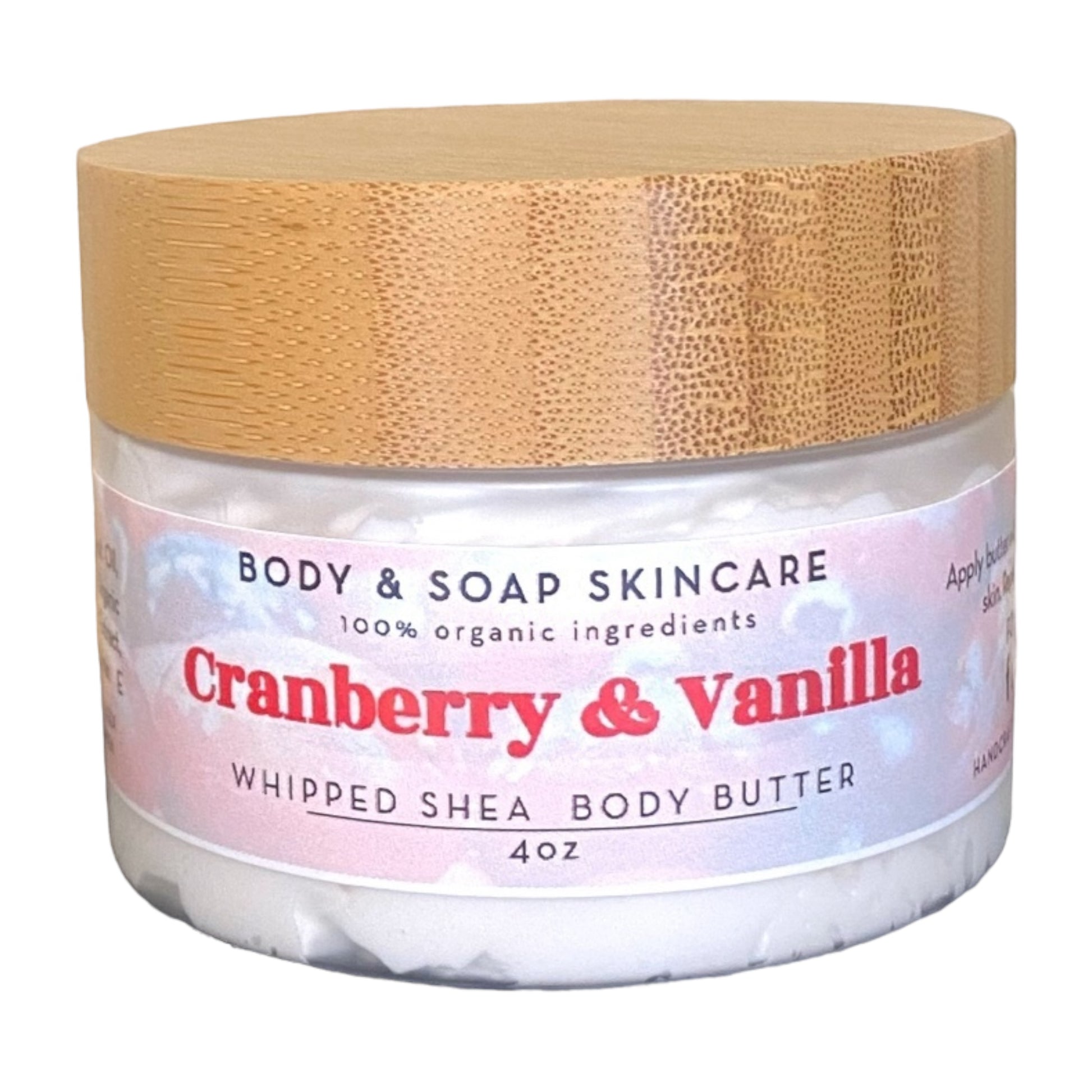 Indulge in the luxurious feel of our organic Cranberry & Vanilla Whipped Shea Body Butter. Made with natural ingredients, this creamy butter will leave your skin feeling silky smooth. Say goodbye to dry skin and hello to nourished, moisturized skin.