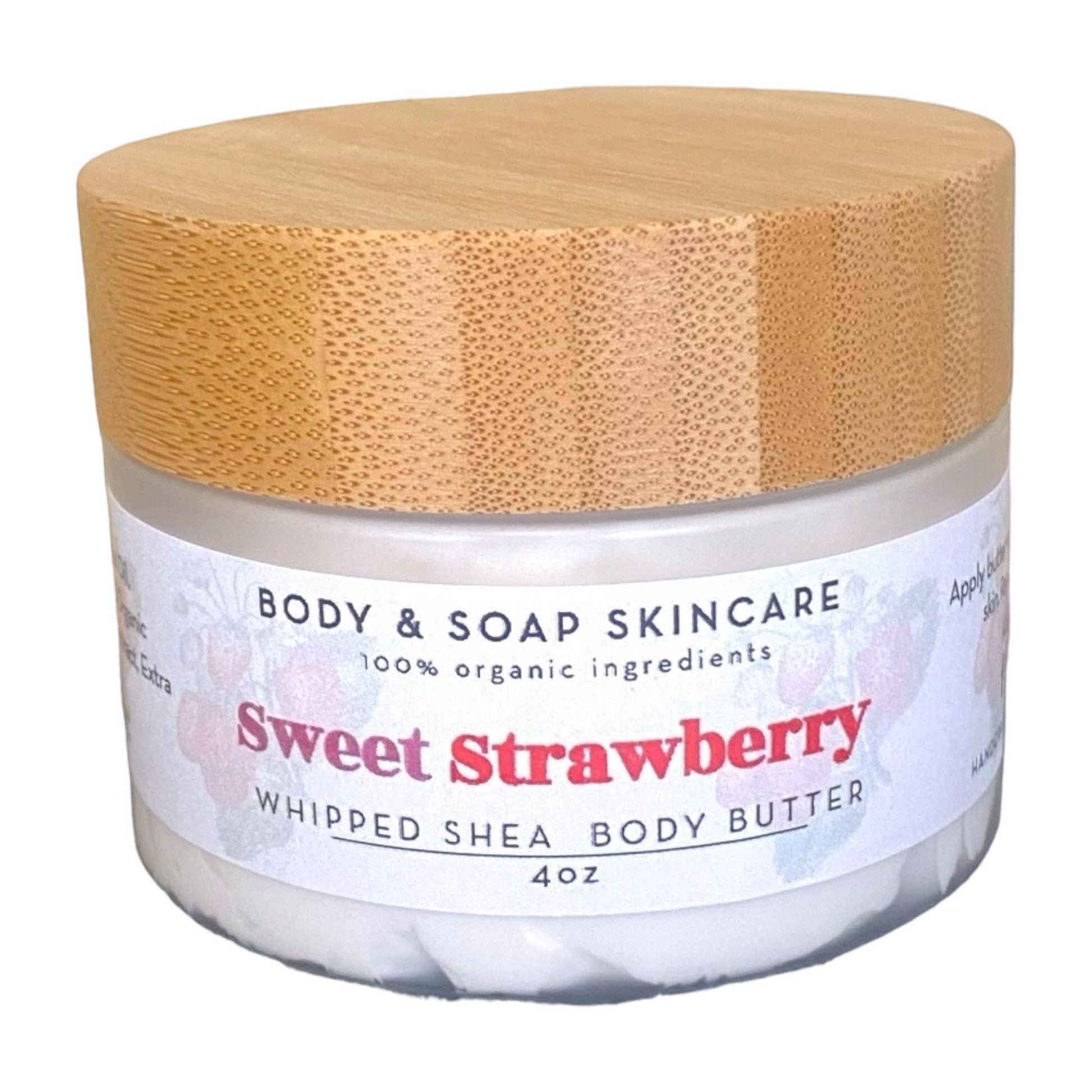 Our Sweet Strawberry Whipped Shea Body Butter not only moisturizes your skin, but also envelops it with a luxurious scent of sweet strawberries. Rich in organic shea, this body butter is whipped to perfection, combining the silky feeling of butter and the invigorating scent of strawberries to delight your senses.